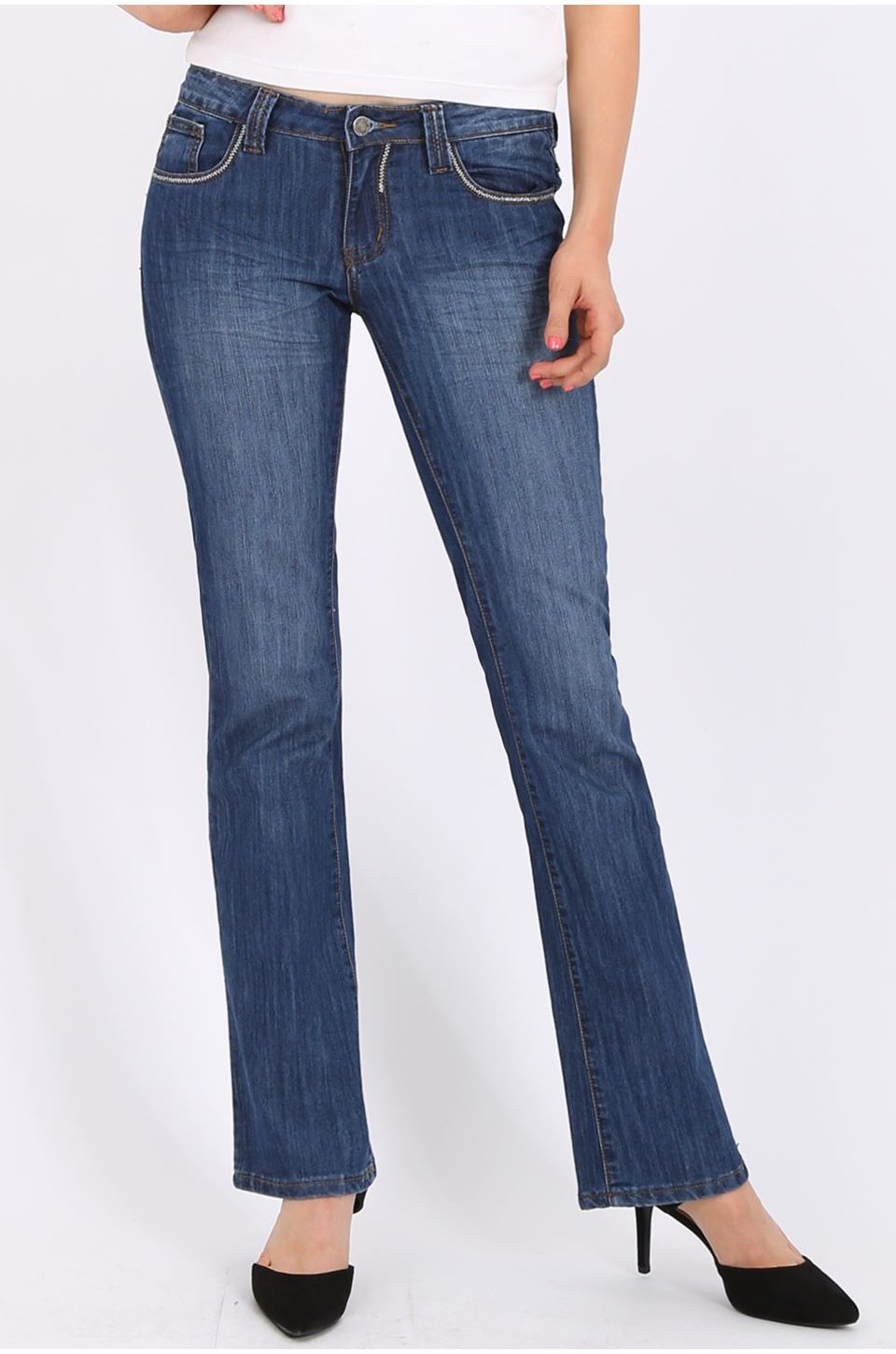 - Zip fly; 5 pocket design